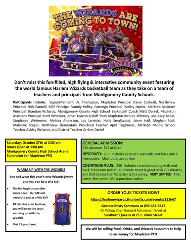 Don't miss this fun-filled, high flying & interactive community event featuring the world famous Harlem Wizards basketball team as they take on a team of teachers and principals from Montgomery County Schools!